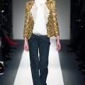 Veste travaillée or à manches trois quart, sur une chemise blanche à col Lavallière et un pantalon flare bleu marine, nouveau "it" de notre garde robe. Collection femme Balmain automne hiver 2010 2011.