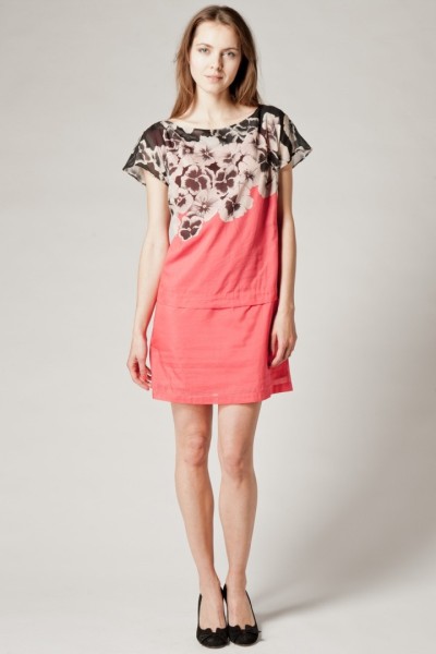 L’imprimé fleuri est dégradé sur le haut du modèle resserré à la taille tandis que le jeu de plis se multiplie sur la poitrine voire même sur l’ensemble d’une autre robe. À noter le décolleté en V aussi bien à l’avant que dans le dos de la robe rose ceinturée.